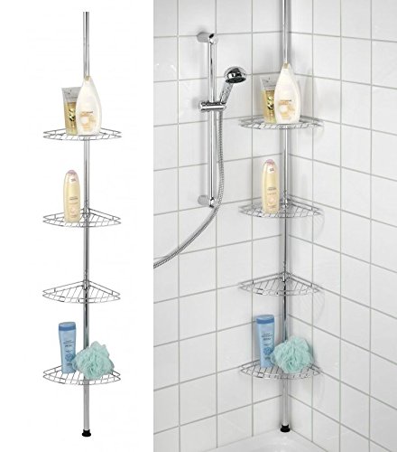 PRODUCT DESCRIPTIONS:4 Tier Corner Shower Shelf Unit. Simple tidy way of storing multiple shower products. Suitable for bathrooms and wet rooms as well as inside showers. Simply add or remove poles or buffers to adjust the height. All 4 shelves can be moved freely to suit your needs. Strong tension-mount spring design installs in an instant between surface & ceiling. No tools or drilling into walls required. Height can be adjusted from approx. 110 to 250 cm.